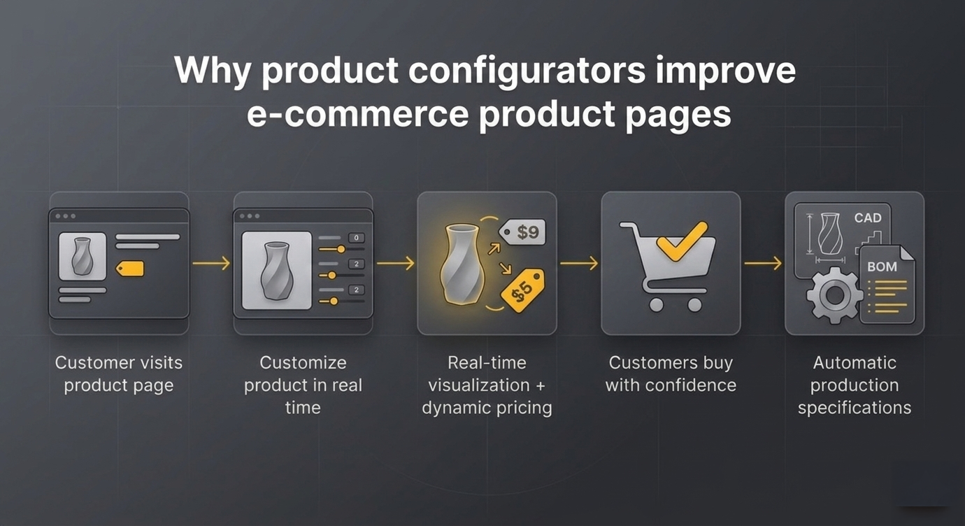 Many of these common pitfalls can be overcome with the right technological solutions. Imagine a system where your customers can visualize their custom product with stunning accuracy, where the customization process is intuitive and delightful, where pricing is always accurate and dynamic, and where production outputs are automatically generated.