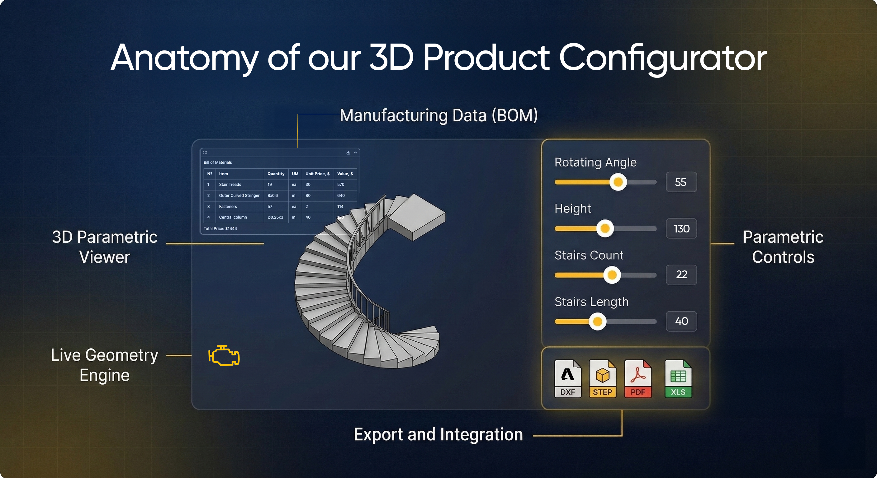 The real power of a modern furniture configurator extends beyond the storefront. Underneath the visual interface sits a parametric model, a set of geometric relationships and formulas that define how the product behaves when dimensions or features change. When a customer finalises their design, the configurator can automatically generate: